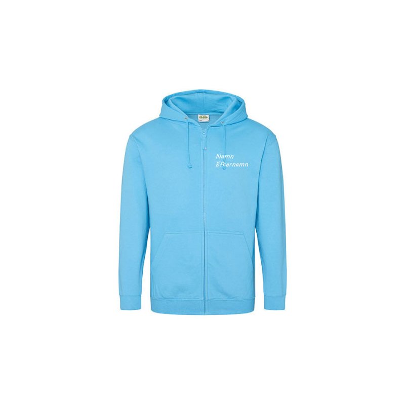 Skön ziphood med dubbel luva och ficka på magen, fleecad insida och ganska rymliga storlekar. Stort vitt tryck över ryggen, ev. namntryck på hjärtat.