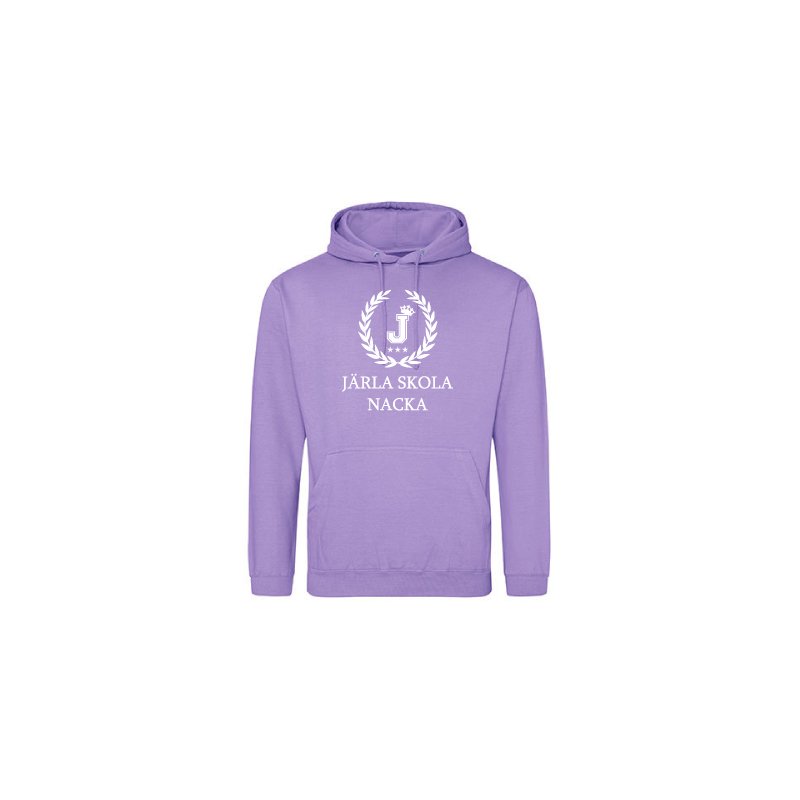 Skön skoltröja med dubbel luva och ficka på magen, fleecad insida och ganska rymliga storlekar. Stort svart tryck över bröstet, ev. namntryck på höger axel.